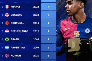 體育資訊11月5日訊 巴黎圣日耳曼小將杜埃贏得了2025年金童獎(jiǎng),德轉(zhuǎn)盤(pán)點(diǎn)了各國(guó)球員贏得金童獎(jiǎng)次數(shù),西班牙以5次居首。