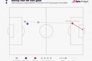 據Opta統(tǒng)計,范德芬?guī)蚺軇?7.7米之后破門,這是2015年Opta統(tǒng)計相關數據以來,歐冠帶球距離最遠的進球。