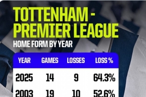 熱刺此前只在1994年、2003年主場輸球場次達(dá)到10場,而今年他們還有4場英超主場比賽。