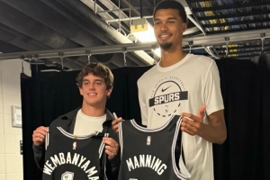本場比賽,德克薩斯大學(xué)橄欖球隊(duì)球員阿奇·曼寧等人現(xiàn)場觀看了本場比賽,并受到了文班亞馬及??怂沟慕哟P侨⑵妗ぢ鼘庍€和文班互換了球衣。