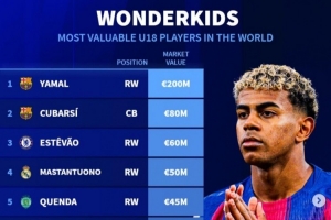 體育資訊11月10日訊 《轉(zhuǎn)會(huì)市場(chǎng)》統(tǒng)計(jì)了當(dāng)前世界足壇U18球員身價(jià)情況,亞馬爾無懸念2億歐獨(dú)自領(lǐng)跑。
