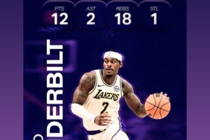 昨天湖人客場102-122不敵老鷹,5連勝終結(jié)。范德比爾特出戰(zhàn)28分鐘,9投4中,三分2中1,罰球3中3砍下12分18籃板2助攻1搶斷1蓋帽,籃板湖人生涯新高。
