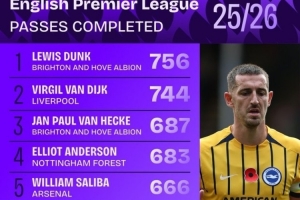 體育資訊11月11日訊 英超聯(lián)賽已經(jīng)進行了11輪,squakwa也統(tǒng)計了本賽季英超成功傳球榜,中場球員僅埃利奧特·安德森和蘇維門迪。