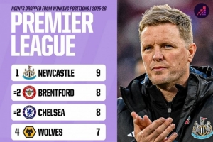 體育資訊11月11日訊 Opta統(tǒng)計(jì)了本賽季英超球隊(duì)領(lǐng)先之后丟掉的積分,并列出榜單,紐卡9分最多,布倫特福德、切爾西8分次席。
