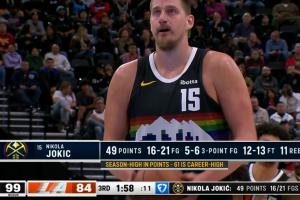 掘金VS快船,三節(jié)結(jié)束,約基奇52分11籃板6助攻1搶斷1蓋帽,22投17中,三分6中5,罰球14罰13中!各節(jié)得分分布:25+8+19。