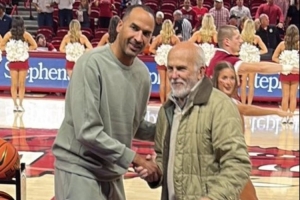 今天他現(xiàn)身NCAA賽場,觀戰(zhàn)阿肯色大學(xué)vs桑福德大學(xué)的比賽。