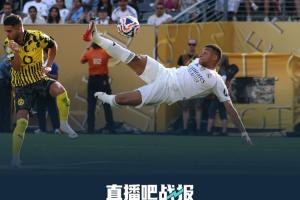 94分鐘,姆巴佩精彩側(cè)勾,皇馬3-1領(lǐng)先多特。