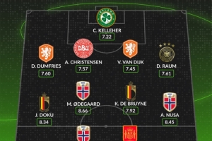 中場:多庫(比利時,8.34分)、厄德高(挪威,8.66分)、德布勞內(比利時,7.92分)、安東尼奧·努薩(挪威,8.45分)