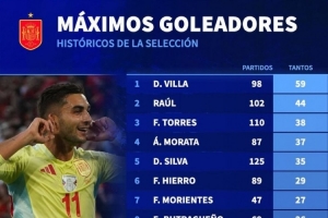 西班牙隊(duì)史射手榜:比利亞59球居首,費(fèi)蘭23球、奧亞薩瓦爾22球