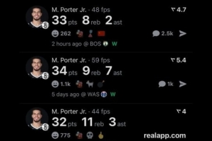 數(shù)據(jù)美媒Real Sports曬出小波特本賽季30+場次(5次)數(shù)據(jù),并寫道:“進(jìn)攻頭號選擇的小波特。”