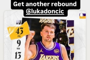 賽后湖人球員拉拉維亞曬出東契奇的數(shù)據(jù)海報(bào),他調(diào)侃道:“你多搶個(gè)籃板啊?!?/p>