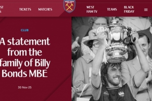 體育資訊11月30日訊 西漢姆聯(lián)今日發(fā)布訃告,俱樂部傳奇球星同時也是隊史出場紀錄保持者比利·邦茲去世,享年79歲。以下為西漢姆聯(lián)足球俱樂部發(fā)布的關(guān)于比利·邦茲家族的聲明,以及對其生平與貢獻的記述: