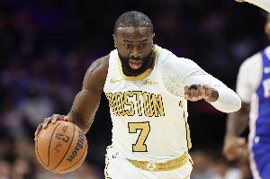 凱爾特人球員杰倫·布朗上半場雖然手感不太理想,但他多次制造罰球拿分,籃板拼搶和策應(yīng)上都做得不錯。