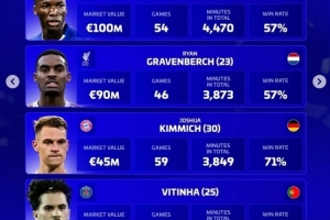 維蒂尼亞(巴黎,25歲,葡萄牙):身價(jià)9000萬(wàn)歐,68場(chǎng),5373分鐘,勝率78%