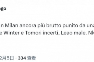 米蘭跟隊(duì)記者隆戈在社交媒體上寫道:“一場(chǎng)糟糕的比賽,米蘭表現(xiàn)更是糟糕,被更具求勝信念的拉齊奧懲罰。德溫特和托莫里表現(xiàn)不穩(wěn),萊奧發(fā)揮不佳,至于恩昆庫——看過比賽的人都會(huì)問,他到底在哪里?”