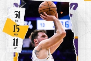 31+15+11!湖人官推發(fā)布東契奇數(shù)據(jù)海報(bào):又一場(chǎng)三雙表現(xiàn)??