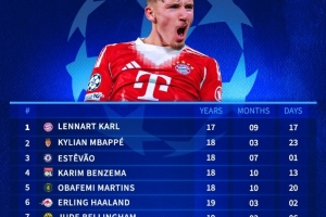 歐冠改制后連續(xù)3場(chǎng)破門最年輕榜單:17歲卡爾居首,姆巴佩次席