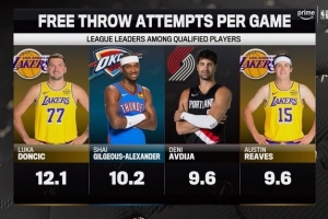 轉(zhuǎn)播方曬罰球前四:東契奇12.1次 SGA第2 阿夫迪亞/里夫斯并列第3