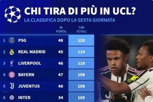體育資訊12月11日訊 德國轉(zhuǎn)會市場統(tǒng)計了本賽季歐冠各隊的射門次數(shù),并列出榜單,巴黎120次射門居首,皇馬、利物浦二三位。