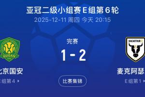 體育資訊12月11日訊 亞冠二級(jí)小組賽E組第6輪,北京國安1-2輸給麥克阿瑟FC。本輪中超球隊(duì)亞冠賽場表現(xiàn),海港、蓉城戰(zhàn)平,國安、申花失利。