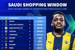 體育資訊7月9日訊 德轉(zhuǎn)統(tǒng)計(jì)各俱樂部向沙特球隊(duì)賣人收入,維拉以1.37億歐居首,波爾圖1.1億歐第二,巴黎1.03億歐第三。