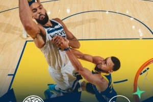 賽后森林狼發(fā)布贏球海報,封面人物為戈貝爾,背景則是在內(nèi)線防守他的庫里。