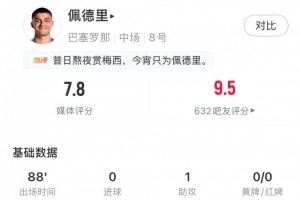 體育資訊12月14日訊 西甲第16輪,巴薩主場2-0擊敗奧薩蘇納,佩德里代表巴薩首發(fā)出戰(zhàn)88分鐘,球員本場數(shù)據(jù)如下: