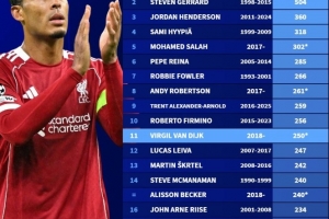 體育資訊12月14日訊 英超第16輪,利物浦在安菲爾德以2-0的比分戰(zhàn)勝布萊頓。本場(chǎng)比賽,紅軍隊(duì)長(zhǎng)范戴克迎來(lái)代表球隊(duì)的第150場(chǎng)英超出場(chǎng),這讓他足以位居隊(duì)史第11位。