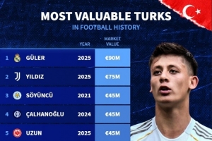 土耳其球員歷史身價(jià)榜:居萊爾9000萬(wàn)歐居首,伊爾迪茲次席
