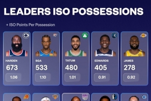 上賽季單打王:哈登單打回合數(shù)最高 杜蘭特效率第一