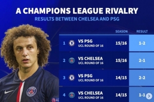 15-16賽季歐冠16強(qiáng)戰(zhàn):切爾西1-2巴黎、巴黎2-1切爾西(巴黎總比分4-2晉級)