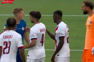 體育資訊07月14日訊 切爾西vs巴黎比賽68分鐘,德拉普爭位置推倒門德斯,多納魯馬對他很生氣。