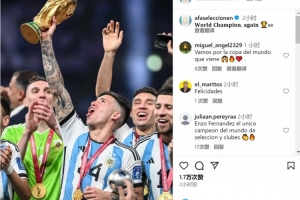阿根廷隊官方社媒曬出恩佐2022年世界杯奪冠后舉起大力神杯的照片,配文:“再次贏得世界冠軍?!?/p>