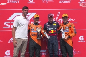 庫爾圖瓦現(xiàn)場觀看F1比利時大獎賽,并與沖刺賽領獎臺車手維斯塔潘、皮亞斯特里、諾里斯合影。