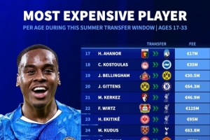 體育資訊7月28日訊 今夏各大聯(lián)賽重磅引援不斷,《轉會市場》也列出了從17歲到33歲的各年齡“標王”。