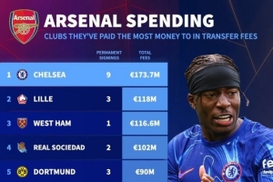 阿森納近20年轉(zhuǎn)會(huì)費(fèi)支出最多的俱樂部:歐元