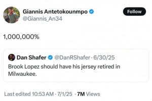 值得一提的是,在7月初,字母哥在回答球迷問答的時(shí)候曾表示,雄鹿會(huì)1000000%退役大洛的球衣。