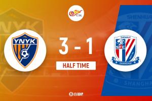 上半場(chǎng)比賽結(jié)束,上海申花客場(chǎng)暫時(shí)1-3落后云南玉昆。