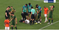 體育資訊06月25日 王鈺棟受傷倒地不起,浙江擔(dān)架進(jìn)場(chǎng)將其抬出,左膝被裹上厚厚冰袋。
