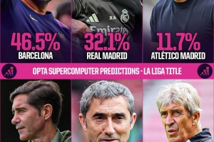 ■以下是Opta超級(jí)計(jì)算機(jī)預(yù)測新賽季西甲冠軍歸屬概率: