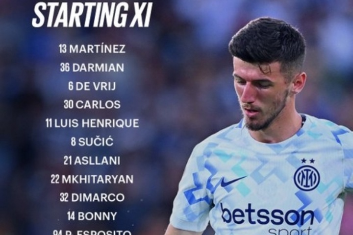 國米首發(fā):13-何塞普-馬丁內(nèi)斯、36-達(dá)米安、6-德弗里、30-奧古斯托、8-蘇西奇、1-阿斯拉尼、22-姆希塔良、32-迪馬爾科、11-恩里克、14-博尼、94-F-埃斯波托尼