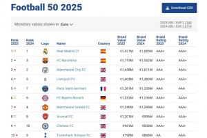 2025最具價值足球品牌:皇馬19.21億第1 巴薩第2 英超big6均前十
