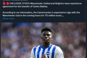 喀麥隆媒體CFOOT報道稱,曼聯(lián)已經(jīng)與布萊頓就巴萊巴轉(zhuǎn)會達成協(xié)議,球員預計將在未來幾個小時與曼聯(lián)簽約,費用1.12億歐元。