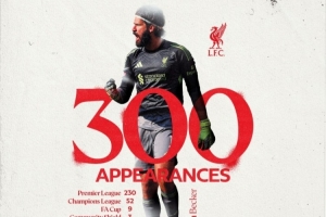 據(jù)利物浦官方統(tǒng)計,這是阿利森代表利物浦出戰(zhàn)的第300場比賽。