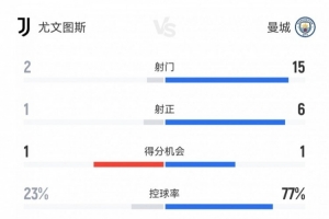 半場(chǎng)攻防!尤文1-2曼城半場(chǎng)數(shù)據(jù):射門2-15射正1-6,控球23%-77%