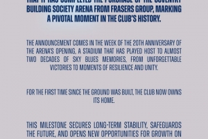 俱樂部公告寫道:“考文垂足球俱樂部欣喜宣布,已完成從弗雷澤集團(tuán)收購考文垂建筑協(xié)會競技場的交易,這標(biāo)志著俱樂部歷史上一個決定性時刻?!?/p>