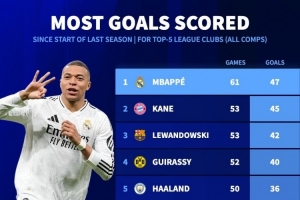 據(jù)德國轉(zhuǎn)會市場統(tǒng)計(jì),姆巴佩加盟皇馬以來攻入47粒進(jìn)球,五大聯(lián)賽球員同期最多。