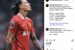 近3個(gè)英超賽季中,場(chǎng)均錯(cuò)失絕佳機(jī)會(huì)最多:努涅斯居首&哈蘭德第二