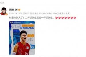 周琦更新個(gè)人微博,歡迎趙睿的到來(lái),寫道:“村里來(lái)新人了!二年級(jí)新生歡迎一年級(jí)新生?!?/p>