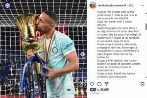 體育資訊8月30日訊 今日,國(guó)米舊將丹布羅西奧在個(gè)人Ins上發(fā)表長(zhǎng)文,宣布退役。